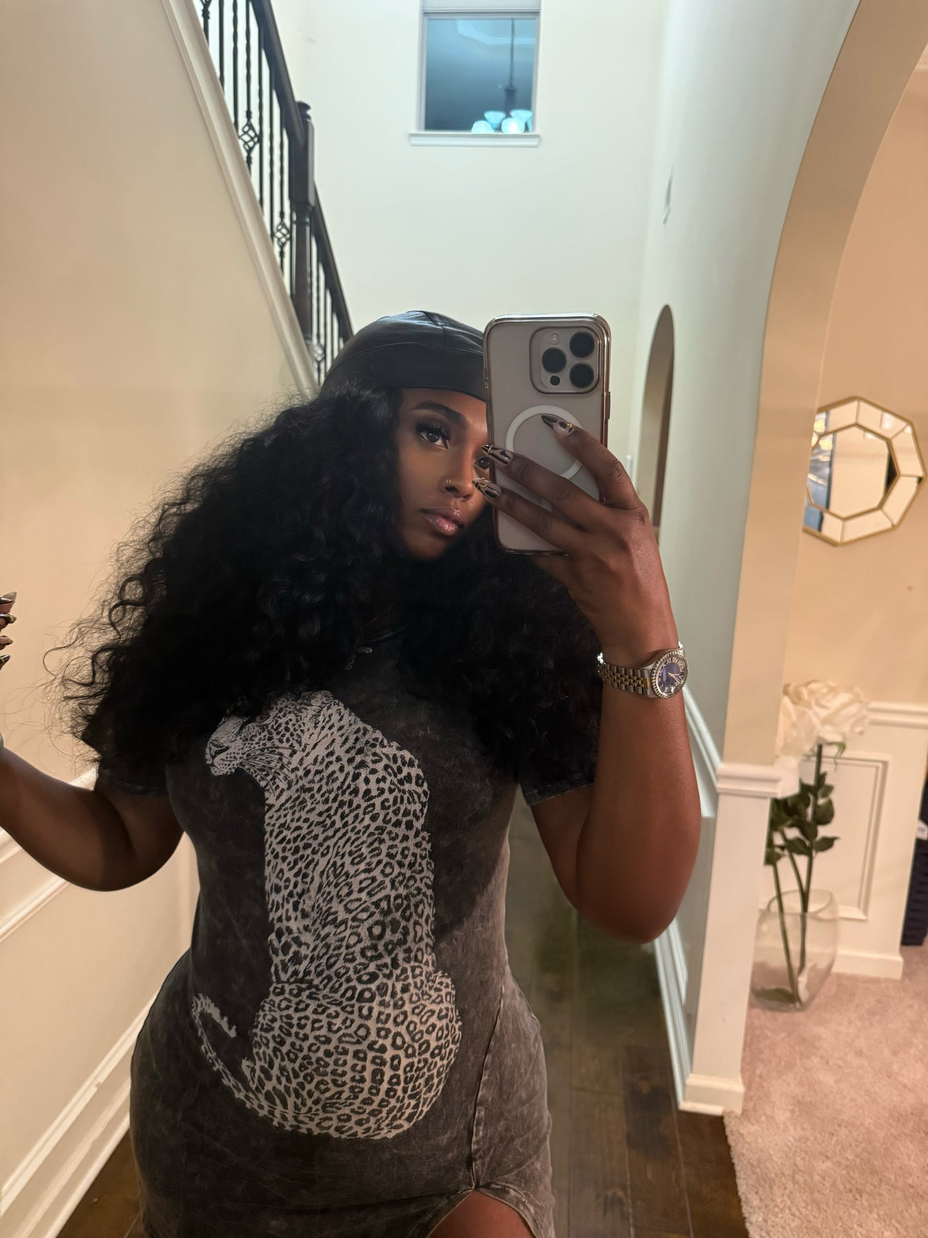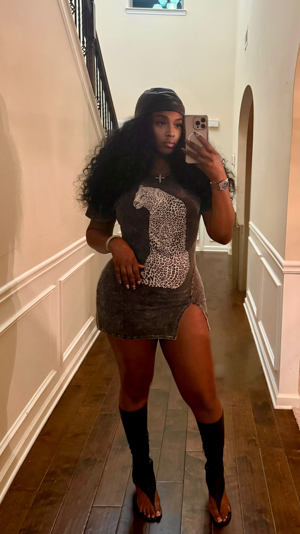 Unleash your wild side in the Savage Stone Mini Dress — a bold, body-hugging piece with vintage edge and main character energy. The stone-washed finish gives it that effortlessly lived-in vibe, while the fierce leopard graphic and thigh-high slit add a touch of danger and allure.